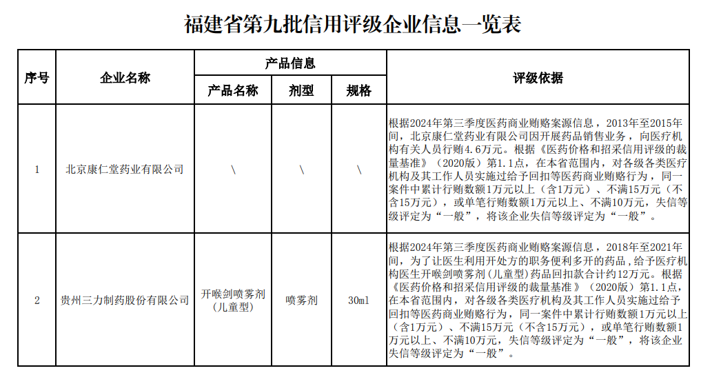 中国经济网北京,9月19日。福建省医疗保险办公室网站最近发布了福建省份药品和设备联合采购中心的通知,涉及大量福建第9批的清单。根据与福建医疗保险办公室有关的规定,建立了针对制药产品价格和招募的信用评估系统(福吉安医疗保险[2021]第1号),以下两家公司目前是北京有限公司,北京有限公司Kangrengang kangrengang Pharmaceutical Co.贿赂案在2024年第三季度,北京kangreng Pharmaceutical Co.,Ltd.。根据“医学和A(202020202020。和水平的类型都致力于医疗商业贿赂元(包括10,000元),150,000元,150,000元(不包括150,000元),或超过100,000元人民币,超过100,000元人民币,超过100,000元人民币,信任的水平是“一般的信任”,是一般的信任,并且是一般性的。