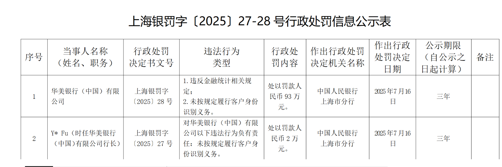 7月24日,上海Yinfeizi [2025]第27-28号,行政罚款信息传播表是Huamei Bank(中国)有限公司,有限公司违反了相关的财务统计规则。罚款930,000元是因为不遵守法规的客户身份识别义务。和*FU(当时的Huamei Bank(中国)有限公司的总裁)在下面列出:Huamei Bank(中国)有限公司,我负责非法活动。
